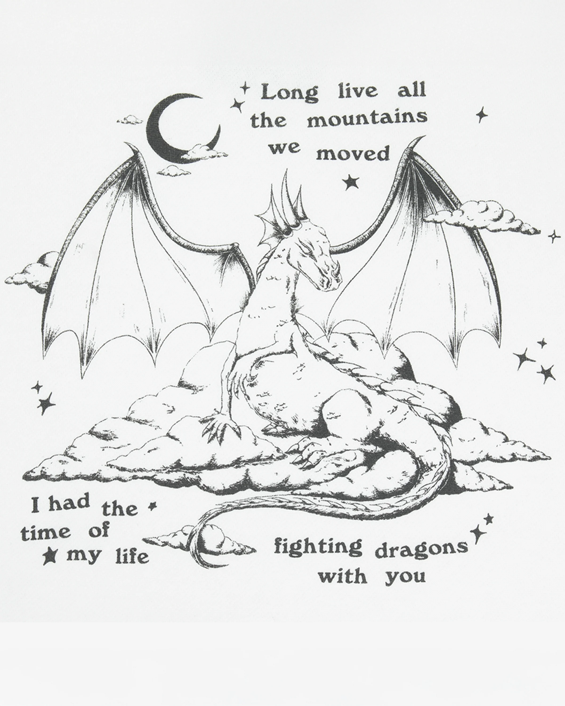 White hoodie featuring dragon illustration with "Long live all the mountains we moved. I had the time of my life. fighting dragons with you" song lyrics printed on front.