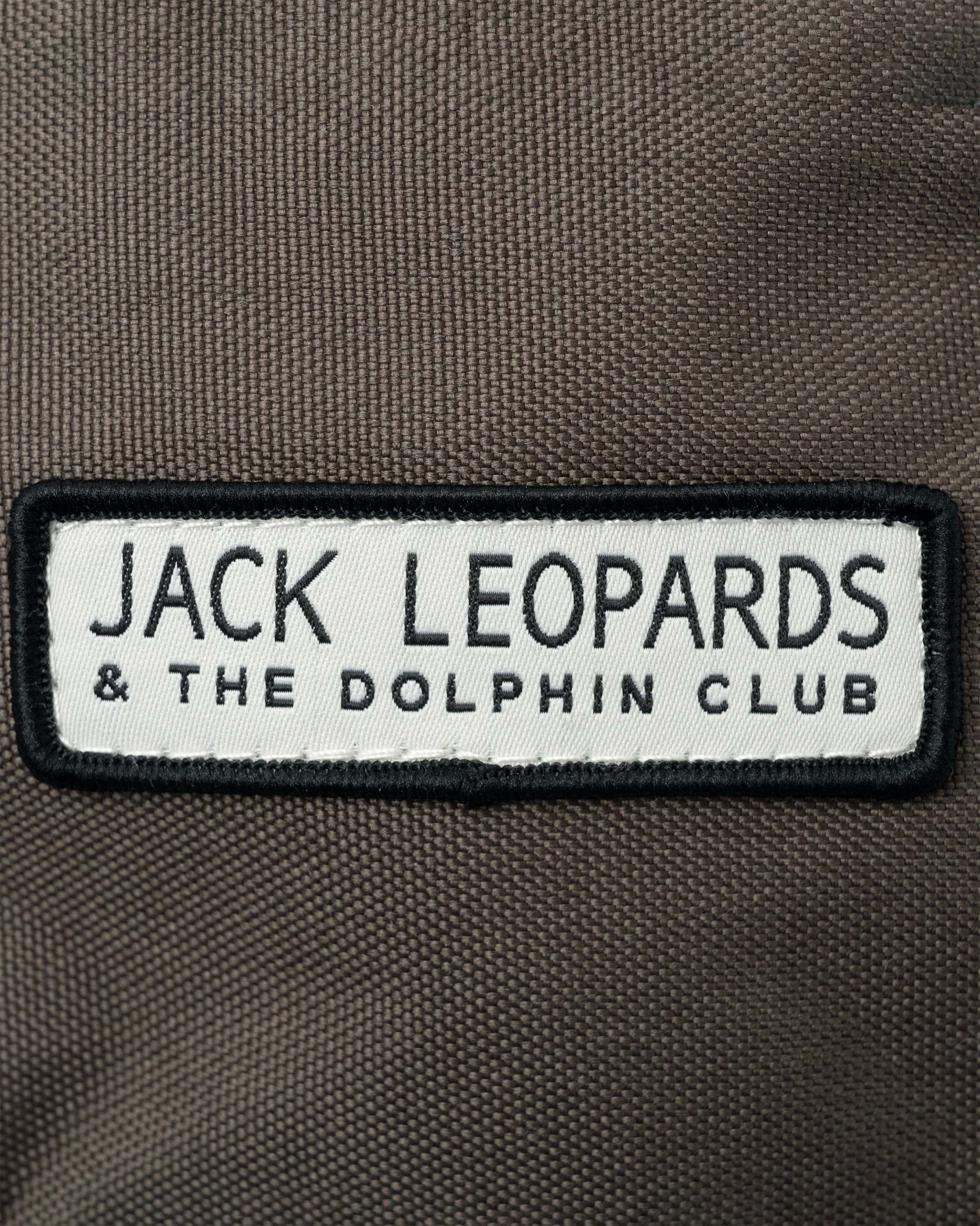 Brown zipper hip bag featuring "Jack Leopards & The Dolphin Club" embroidered on front woven label with "Jack Leopards & The Dolphin Club" repeating logo printed on adjustable strap with buckle closure.