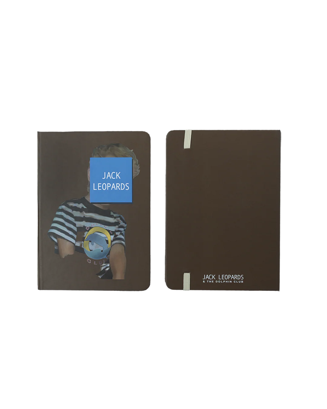 Brown hardcover notebook with elastic closure and ribbon bookmark featuring Jack Leopards & The Dolphin Club image on the front with "Jack Leopards & The Dolphin Club" printed on the back and lined pages with watermarked "Look What You Made Me Do" song lyrics on bottom right of each page.