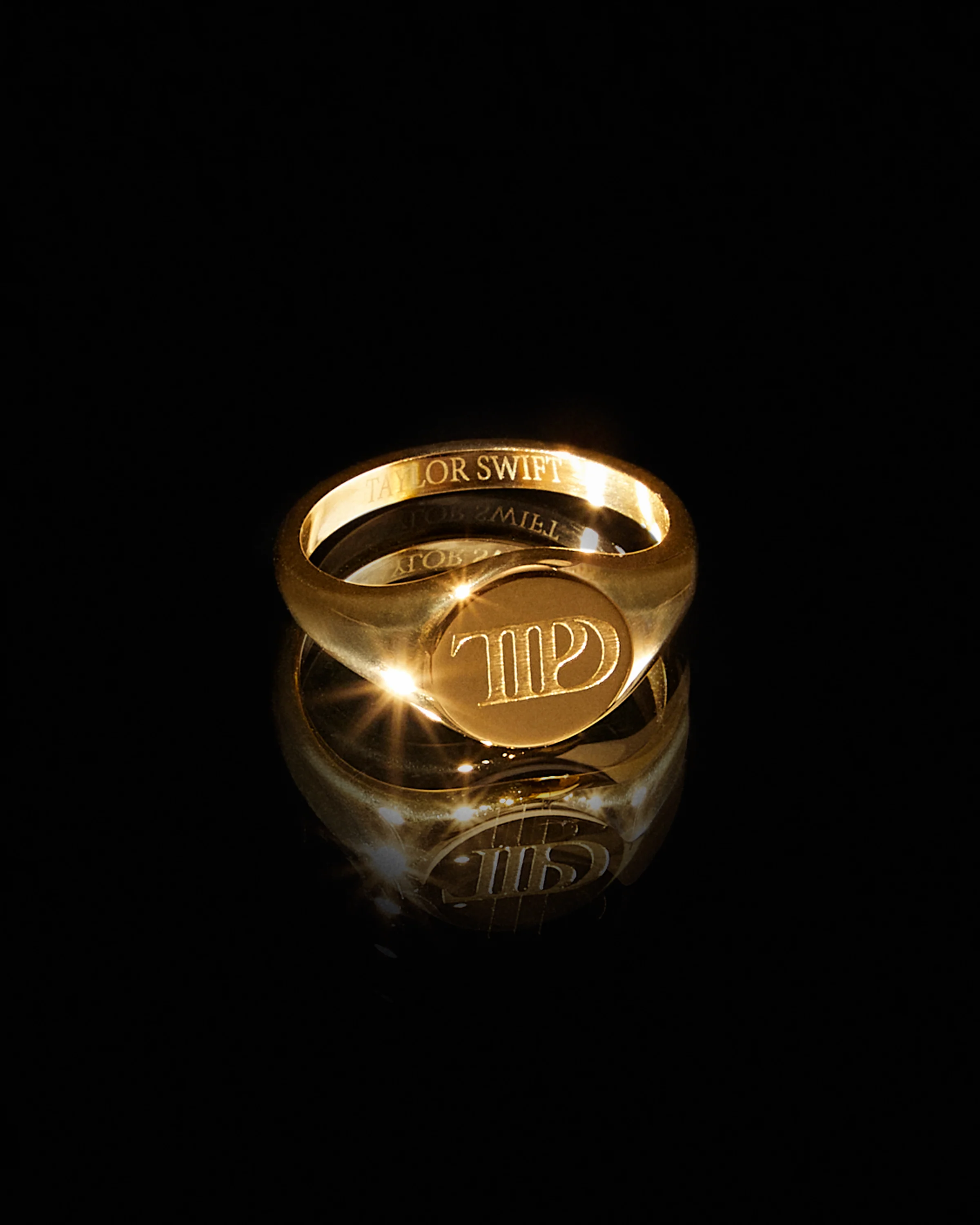 Gold-plated ring featuring "TTPD" album logo engraved on top and "Taylor Swift" engraved along the inside. Comes with cotton/poly cinch bag featuring "TTPD" album logo printed on front.