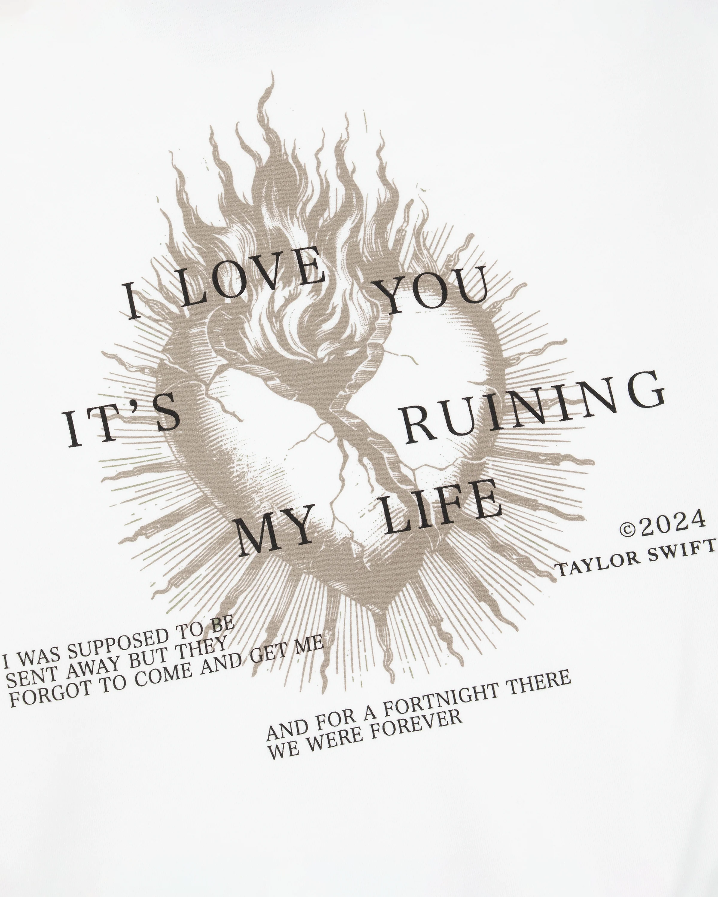 White crewneck featuring "TTPD" album logo and "The Tortured Poets Department" printed on front with a heart and flames design, "I Love You It's Ruining My Life" song lyrics, "I Was Supposed To Be Sent Away But They Forgot To Come And Get Me" song lyrics, "And For A Fortnight There We Were Forever" song lyrics, and "©2024 Taylor Swift" printed on back.