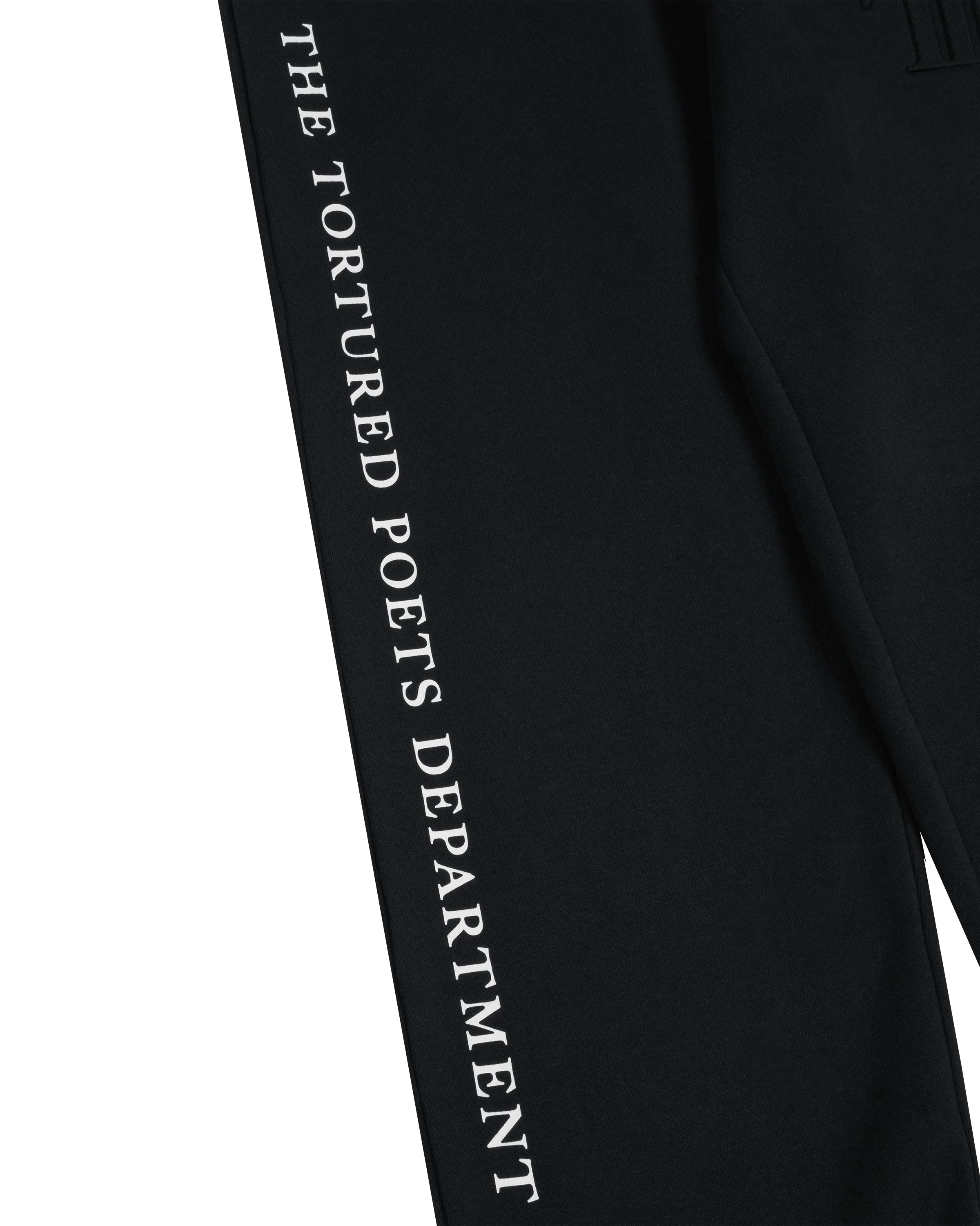 Black sweatpants featuring "TTPD" album logo embossed on wearer's left leg and "The Tortured Poets Department" printed down wearer's right leg. Drawstring waist and side pockets.